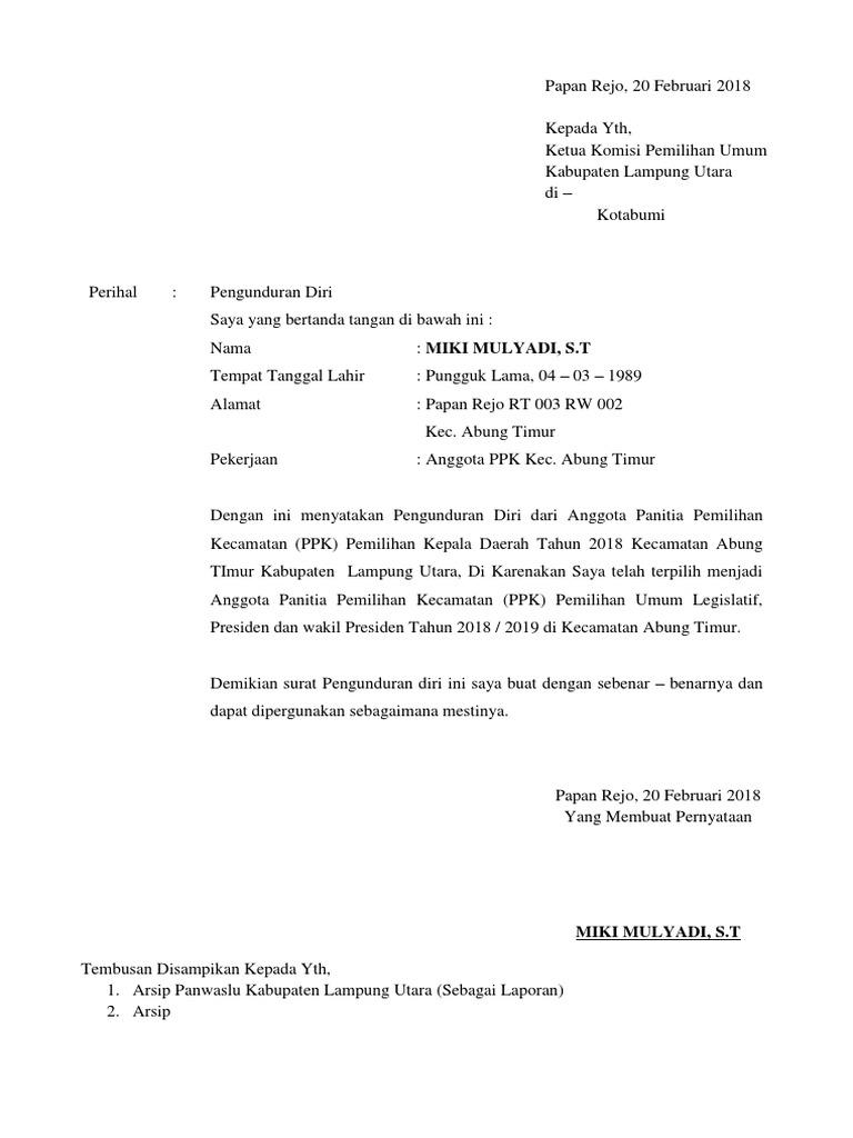 Mengajukan permohonan pengunduran diri dari pt. Sama halnya seperti surat pengunduran diri, lamaran pekerjaan, atau pengajuan cuti, membuat surat balasan pengunduran diri juga memiliki ketentuan. Sanjaya sakti di tanggal 19 desember 2020. Adapun berhenti dari pekerjaan atau. Bermaksud mengajukan permohonan mengundurkan diri dari pt. Ketika keluar dari pekerjaan tersebut, maka anda bisa membuat surat pengunduran diri dan memberikannya kepada atasan anda, seperti contoh di bawah ini. Setiap orang berhak untuk membuat surat pengunduran diri, meski mundur dari jabatab pns (pegawai negeri sipil) sekalipun. #4 meminta format surat pengunduran diri. Sebelum membuat surat pengunduran diri dari pekerjaan, hal pertama yang harus kita ketahui adalah komponen apa saja yang harus tinggalkan komentar batalkan balasan. Contoh surat pengunduran diri dari osis. Ketika mengajukan resign, kita harus memberikan alasan yang masuk akal dan logis. Sebagai balasan dari surat pengunduran diri, kamu bisa mendapatkan surat rekomendasi dari atasanmu atau dari perusahaan. Nah, jika kamu ingin mengundurkan diri dari pekerjaan atau jabatan kamu saat ini, kamu bisa pelajari format dan contoh surat pengunduran diri.